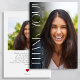 Feiern Sie Ihren Abschluss stilvoll mit unserer Modern Foto Abschluss Dankeschön Card, eine elegante und herzliche Art, Ihre Wertschätzung zum Ausdruck zu bringen. Diese individuell gestaltbare Karte zeichnet sich durch ein sauberes, zeitgemäßes Design aus, das Platz für Ihr Lieblingssymbol(e) sowohl vorne als auch hinten bietet (mit den gleichen oder verschiedenen Bildern) - ideal, um Ihre Senior-Porträts oder einen unvergesslichen Abschluss-Moment zu zeigen. Personalisieren Sie den Text so, dass Ihre Nachricht wirklich Ihre ist, egal ob Sie Freunden, Familie oder Mentoren für ihre Unterstützung danken. Das Herz vor der Signatur auf der Rückseite ist eine svg Datei - so können Sie in jede gewünschte Farbe wechseln. Das minimalistische Layout hebt Ihre Fotos hervor und behalte dabei den Fokus auf Ihre Dankbarkeit. Gedruckt auf hochwertigen Cardstock mit lebendigem, farbigem Druck, ist jede Karte ein Sake, den Ihre Lieben lieben werden. Ob Sie sie verschicken oder persönlich ausgeben, diese moderne Dankeschön-Karte ist die perfekte Touch für Ihre Abschluss-Feier. Erhältlich in verschiedenen Farbvarianten, Größen und Papiertypen, die Ihrem Stil entsprechen. Lassen Sie Ihre Erinnerungen glänzen - und Ihr Dank unvergesslich.