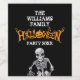 Cooles, alljährliches Familienweinetikett mit einem gruseligen Skelett, das über einem schwarz-orangefarbenen Halloween-Party und einer phantastischen Kürbislaterne hängt. Passen Sie diese Labels mit Ihren großen Bash-Informationen für alle Ihre Gäste an.