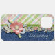 Zeitgenössisches Korallenrosa, blau, violett lila, türkisfarben, gelb, minzgrün und weiß diagonal gestreiftes kartanisches kariertes Muster, Kalkgrün mit weißen Punkten und pastellfarbenen romantischen Blumengarten auf einem blauen Jeans denim Hintergrund. Mit Raum zum Anpassen oder Personalisieren mit Namen, Monogramm oder Initialen Ihrer Wahl. Schönes, modernes und cooles Cover für den Trend-erfahrenen und kunstliebenden angesagten Trendsetter, künstlerischer Motiv-Liebhaber, der will, ihr Handy vor Staub und Schmutz, Abnutzung und Tränen zu schützen. Dieses Design ist erhältlich Apple iPhone 6, 7 und 8 Plus, 10 oder X, XR, XS , 11, 12, und 13 Mini und 14 Pro Max Handy Hüllen. Zeigen Sie Ihren persönlichen Stil, sehen Sie modern aus und fühlen Sie sich stilvoll mit einem einzigartigen Design auf einem mobilen Zubehör Ihrer Wahl.