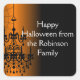 Personalisierter Aufkleber für Leckereien, Gefälligkeiten oder andere Halloween-Party Dekoration. Ausgeklügeltes und dennoch beängstigendes Bild einer eleganten Kronleuchter-Silhouette vor einem leuchtend orangefarbenen Hintergrund mit einem Spinnennetz in der Ecke. Finde die Spinne auf dem Kronleuchter. Schwarz und dunkel lila Hintergrund Set alles aus. Passen Sie es Ihrem Halloween-Party an oder feiern Sie es einfach. Alle Bilder © CustomInvitesOnline.com