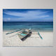 Ein Fischerboot mit gebündeltem Netz auf einem wunderschönen und friedlichen Sandstrand auf der Insel Boracay, Philippinen. Dieses kleine Boot wird warten, bis es dunkel wird, bevor Sie irgendwelche Aktionen sehen. Während des heißen Tages gehen die Fische tiefer, sodass die Fischer bis zum Abend oder Morgengrauen warten, bevor sie mit ihren Netzen ausgehen. In der Zwischenzeit entspannt sich das kleine Boot am Strand und genießt das ruhige Meer. In meiner Galerie gibt es noch mehr Wüstenlandschaften und Landschaften.
