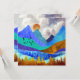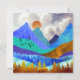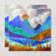 Dieses prächtige Design zeigt eine farbenfrohe Berglandschaft mit pufffarbenem, bewölktem Himmel und sanften Hügeln in kühnen Texturen und Farben wie Blau, aquamarin, Cyan, Gold und Orange.