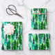 Papier in einem Aquarellmuster in einem Bergwald in Schattierungen von mittlerem bis dunklem Kieferngrün auf einem weichen, wasserfarbenen Hintergrund