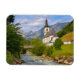 Rechteckiger Foto-Magnet mit Landschaft mit Kirchenanbindung an einen Bergbach mit im Hintergrund liegenden Alpenbergen an einem Sommertag in Ramsau bei Berchtesgaden in Bayern, Deutschland, an der Grenze zu Österreich.