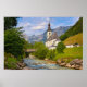 Plakatdruck einer Landschaft mit einer Kirche neben einem Bergbach im Hintergrund Alpengebirge an einem Sommertag in Ramsau bei Berchtesgaden in Bayern, Deutschland, an der Grenze zu Österreich.