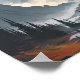 Dieses Plakatdesign zeichnet sich durch eine friedliche Berglandschaft bei Sonnenaufgang aus. Die große orangefarbene Sonne erhebt sich hinter den mächtigen blauen Bergen und strahlt ein warmes Licht über das miessige Tal unten aus. Dunkle immergrüne Bäume säumen den Vordergrund, mit einem ruhigen Fluss, der durch die Szene schlängelt. Die sanften Farben verleihen dem Plakat ein ruhiges und beruhigendes Gefühl, das perfekt für jeden Naturliebhaber geeignet ist.