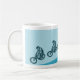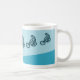 Ein abwärts gelegenes Mountainbike, das sich massiv um die Außenseite dieser Kaffeetasse springen lässt. Die Bilder sind in Blau gehalten. Ich zeichnete dieses Fahrrad von Hand und zeichnete es dann als Vektorbild neu. Das Bild mit weißer Raumtechnik, um den Fahrer und seinen Rigg zu bilden.