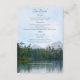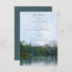 Diese landschaftliche rustikale Hochzeitskunstkarte zeigt eine Ölpastellskizze eines leicht zerklüfteten, aber ruhigen Sees, mit weit entfernten, üppigen Evergreens, Zedernbäumen und Felsstrukturen, die auf der Oberfläche reflektiert werden, und abgelegenen Bergen unter einem blauen Himmel mit klauen Wolken aus der Sicht eines Paddlerkayakings am See oder eines Wanderers am gegenüberliegenden Ufer - gemischte Schriftart ist ein aquamariner Koordinatmetscher blau - von katz_d_zynes