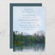 Diese landschaftliche rustikale Hochzeitskarte zeigt eine Ölpastellskizze eines leicht zerklüfteten, aber ruhigen Sees, mit weit entfernten, üppigen Evergreens, Zedernbäumen und Felsstrukturen, die sich auf seiner Oberfläche reflektieren, und abgelegenen Bergen unter einem blauen Himmel mit klauen Wolken aus der Sicht eines Paddlerkayakings am See oder eines Wanderers am gegenüberliegenden Ufer - gemischte Schriftart ist ein aquamariner Koordinatmetscher blau, wie auch die Einladung zurück - von katz_d_zynes