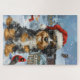 Dieses festliche Design spiegelt den fröhlichen Geist der Urlaubssaison wider und besticht durch ein hübsches Jungtier mit einer Weihnachtsmannmütze. Der Hund ist eingebettet in ein winterliches Wunderland, mit einem Schneemann, einem dekorierten Weihnachtsbaum und wunderschön verpackten Geschenken. Schneeflocken fallen sanft ab und geben der Szene eine magische Touch, während die lebhaften Farben der Feriendekorationen eine warme und fröhliche Atmosphäre schaffen.