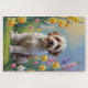 Ein fröhlicher Hund sitzt friedlich auf üppig grünem Gras, umgeben von bunten Frühlingsblüten unter einem weichen blauen Himmel. Dieses digitale Ölgemälde erfasst einen ruhigen Moment mit ausdrucksvollen Pinselstrichen, warmen Farben und einem Gefühl sanfter Freude.