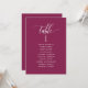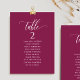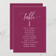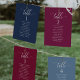Helfen Sie Ihren Gästen mit diesen eleganten, modernen Sitzplakaten mit Gästebamen ihren Tisch zu finden. Doppelseitige Karten, damit die Gäste von beiden Seiten, vorn oder hinten nach ihren Namen suchen können. Klare Platzverhältnisse, die Ihnen die Möglichkeit geben, Clips oder Lochausschnitte für hängende Displays zu verwenden oder Tischhalter/Rahmen zu verwenden. Berry Hintergrund und weißer Text. Moderne handgeschriebene Kalligrafiedetails. Mehrere Farboptionen. Haben Sie alle Tischnummern in der gleichen Farbe oder mischen Sie die Farben nach dem Farbthema Ihres Events. Teil unserer Kollektion "Berry, Blue and Burgundy Floral".