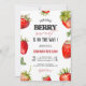 Ce joli baby shower Party Invitation design présente un cadre de fraise rouge adorable sur un blanc avec typographie noire personnalisable.