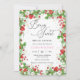 Eine Braudusche zum Thema Erdbeere mit einem Rahmen aus wasserfarbenen Erdbeeren, weißen Blume und Grünpflanzen. Ergänzt wird es durch eine elegante und feminine handgeschriebene Schrift-Typografie und eine süße Erdbeersamen Rückseite. Ideal für ein beerisches Brautparty, besonders im Sommer.