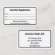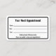 Dieser berufliche Arztbesuchskarte ist zweiseitig. Beide Seiten haben eine schwarze Grenze. Auf der einen Seite steht "Ihr nächster Termin" und hat Zeilen für den Namen, das Datum und die Uhrzeit des Termins des Patienten. Am unteren Rand können Sie Text anzeigen, um eine benutzerdefinierte Nachricht zu erstellen, falls gewünscht. (Angezeigt: Bitte geben Sie 24 Stunden im Voraus an, wenn Sie Ihren Termin nicht behalten haben.) Auf Seite zwei können Sie Text anzeigen, den Sie durch den Namen des Arztes (oder Praxisnamen) und seine Adresse, Telefonnummer und Website ersetzen können. Alle Texte können bearbeitet oder gelöscht werden. Der Text ist schwarz.