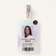 Ein modernes und berufliches pastellfarbenes holografisches Foto-ID-Abzeichen mit Logo und Strichcode.