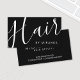 Die berufliche moderne Schwarz/Weiß Haar Stylist Business Card mit dem Wort "haar" im modernen Kalligraphie-Schriftart-Stil auf der Vorderseite und Details in modernen Sans Serif Schriftart Stil auf der Rückseite. Perfekt für Haarstylisten, Schönheitssalon und viele andere Berufe.