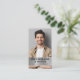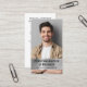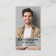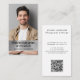 Moderne Visitenkarte mit Ihrem Foto überlagert mit Ihrem Namen und Titel in fett gedruckter Typografie auf einem bürstenartigen silbernen Imitat Metallstreifen. Fügen Sie auf der Rückseite Ihre Kontaktinformationen hinzu und geben Sie eine URl-Adresse ein, um einen scannbaren QR-Code zu erstellen, der mit Ihrer Website, Ihrem Portfolio, Ihrem Social Media-Profil oder einer anderen Plattform, die Ihre Arbeit zeigt, verbunden ist.