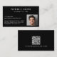 Elegante, berufliche schwarze Visitenkarte mit Ihrem Foto und Ihren Namen, Titel und Kontaktinformationen (z.B. E-Mail, Telefonnummern, Firmennamen und Postanschrift) in einer modernen, sauberen Schrift. Auf der Rückseite geben Sie eine URL-Adresse ein, um einen scannbaren QR-Code zu erstellen, der mit Ihrer Website, Social Media-Profilen oder einer anderen Plattform verknüpft ist, die Ihre Arbeit zeigt. Dies erleichtert es anderen, Ihre Expertise zu erkunden und zusätzlichen Text hinzuzufügen oder leer verlassen.