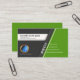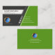 Das Design weist ein grünes Trapez auf der rechten Seite mit einer grauen Unterlage auf. Auf dieser Ebene befinden sich die Schaltflächen für das Mediensymbol, die eine Verbindung zu Ihren Geschäftskontakten herstellen. In einer weißen Rechteckspalte befindet sich der Name und der Titel des Auftrages im Norden. In der Nähe der Mitte befinden sich das Gold-Logo und der Firmenname des Imitate.