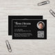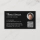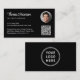 Elegante, berufliche Visitenkarte, die Ihr Foto in einem Kreis-Rahmen zeigt, Ihren Namen in einem fett-stylischen weißen Skript zeigt und Ihre Titel- und Kontaktinformationen (wie E-Mail, Telefonnummern, Firmenname und Postanschrift) in einer sauberen, einfachen Schrift. Geben Sie eine URL-Adresse ein, um einen skalierbaren QR-Code zu erstellen, der mit Ihrer Website, sozialen Medienprofilen oder einer anderen Plattform verknüpft ist, die Ihre Arbeit präsentiert. Dies macht es anderen leicht, Ihre Erfahrung zu erforschen. Laden Sie Ihr Logo auf die Rückseite hoch oder verließ leer.