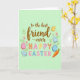 This greeting card features a soft mint green background with a friendly two-part message centered on the front. Near the top center, “to the best friend ever” appears in smooth brown cursive lettering, giving the words a gentle, affectionate tone. Just below it, “HAPPY EASTER” is set in rounded, multicolored letters—pinks, oranges, yellows, and blues—with a thin outline that helps each letter stand out. Around the text, four decorated eggs in speckled pink, sunny yellow, and light blue sit like little gifts, each dotted with small white spots for added texture 🐰. Tender green leafy sprigs and small, simple flowers curl around the message, creating a loose wreath shape that feels like a friendly hug between close companions 🌷. In the lower right corner, an orange carrot with leafy green tops adds a bright accent and balances the layout. The flowers are scattered in soft tones near the edges, with the eggs spaced evenly around the center to frame the words.