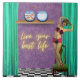 Spaß & Funky inspirierende Vignette zeigt "Leben Sie Ihr bestes Leben" im Neon Schriftart mit Vintagen Frauen in niedlichen Badeanzug stehend auf Stuhl...Vergessen wir auch nicht, den Goldfisch zu bemerken, der von der Menge in seine eigene Schüssel springt!