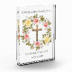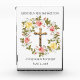 Pastellgelbe und rosa Rosen auf einem blumenreichen Kranz mit goldenem Kruzifix - Alle Texte und Schriftart sind anpassbar.