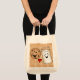 Festlicher Cartoon Lebensmittelgeschäfttasche Spaßes des hohen Glases weißer Milch mit einem glücklichen Lächelngesicht und ein geschmackvoller Schokoladenkeks. Sie sind beide, mit einem roten Herzen in-between grinsen. Dunkles und hellbraunes Farbschema mit Spaßmustern und -farben. Dieser Entwurf ist in vieler unterschiedlichen Produktauswahl verfügbar.