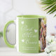 Diese Best Mama je Tasse in grünen Farben ist eine Vorlage mit einem Platz für zwei Ihrer Fotos und für die Eingabe von Namen. Das Design ist mit Herzen dekoriert, die Typografie ist elegant und modern. Es ist eine perfekte Geschenkidee für Mutter.