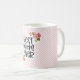 Die Tasse zum Muttertag mit Best Mama Ever Zitat, umgeben von Blumenbouquets mit gestreiftem rosa Hintergrund.