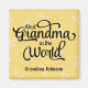 Elegantes, benutzerdefiniertes Skripttypografie-Design mit Worten, "Best Oma in the World" in schwarzen Kalligraphiebriefen mit speziellen Glyphakzenten. Bereich unten für Ihren individuelle Name oder Ihre Nachricht. Hintergrund ist ein erfrischendes, gelb-weißes Blume-Muster.
