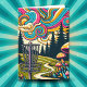 Ich wünsche dir den besten Geburtstag par. Ein einzigartiger, farbenfroher Golfplatz in einem Feld von Retropilzen, Kiefernbäumen, bunten, wirbelnden Wolken in Vintagen Farben wie Blau, Grün, Rosa und Orange.