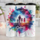 Diese herzerwärmende Grafik zeigt die Silhouette eines stehenden Vaters mit drei Kindern - einem Jungen und zwei Mädchen - gegen einen atemberaubenden, wirbelnden kosmischen Nebel. Die zentrale kreisförmige Gestaltung strahlt lebendige, rosa, blaue und lila Farbspritzen aus. Unter der Familie wird der Text "DER BESTE VATER IN DER Galaxie" angezeigt, mit "Galaxy" in einem stilisierten Skript-Schriftart dargestellt.