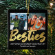 Personalisierte Weihnachtsschmuck mit einem angesagten, schwarzen Hintergrund, der in jede Farbe verändert werden kann, das Wort "besties" in einem Schriftart mit Goldfolie, ein Freundschaftsangebot, Ihre Namen und 2 quadratische Fotos auf beiden Seiten.