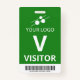 Vertikales Abzeichen mit einem schlichten, weißen Design vor einem grünen Hintergrund. Eine große weiße V macht es einfach, den Besucher als solchen schnell zu erkennen. Personalisieren Sie mit Ihrem Firmenlogo und einem Bar-Code.