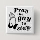 Knopf auf einem weißen Hintergrund mit schwarzem Text und Bild. Die Illustration ist auf der unteren und ist von Händen im Gebet. Rechts von den Händen, in gebogenem, serifenigem Schriftart, steht: "Bete den Schwulen zum bleibe."