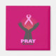 Hände in Richtung Himmel mit leuchtendem Licht rund um das rosa Brustkrebs Bewusstsein Band und Text, der betet für eine Heilung.