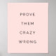 Wusstest du, dass du die Hintergrundfarbe in eine beliebige Farbe deines gewollt oder dein eigenes Foto zum Hintergrund des Zitats hinzufügen kannst? Klicken Sie einfach auf die Schaltfläche "Anpassen" und löschen Sie den rosa Hintergrund und fügen Sie entweder Ihr eigenes Foto hinzu oder wählen Sie eine neue Hintergrundfarbe aus der Farbpalette. "Beweisen Sie, dass sie verrückt sind". Stille die Zweifler mit diesem inspirierenden motivierend Zitat, in einem stilvollen minimalistischen typografischen Design von rot-schwarz und rosa. Lass dieses positiven Zitats, um deinen Tag zu heben und dich daran zu erinnern, an deine Mission zu glauben. Das ideale Geschenk für Unternehmer, Kleinunternehmer oder alle, die hart arbeiten, um ihre Träume gegen die Chancen zu verwirklichen.