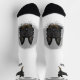 Desteis originelle Cartoon-Illustration eines schwarzen, zweifarbigen deutschen Schäferhundes. Der Hund wird zusammen mit einem personalisierbaren Textbereich für einen Namen oder einen anderen benutzerdefinierten Text auf den Wadendesignbereich gelegt. Ein nahes Oberteil des Hundes wird auf der Vorderseite auf einem grauen, runden Hintergrund platziert. Die Kanten der grauen Hintergrundfarbe verblassen in Weiß. Die graue Farbe wird auch auf den Socken mit einem weißen Streifen durch die Socken sichtbar. Die graue Farbe kann auf Wunsch in jede andere Farbe geändert werden.