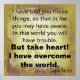 Bibelverse von John 16:33 "Ich habe dir diese Dinge gesagt, damit du in mir Frieden haben kannst. In dieser Welt wirst du Schwierigkeiten haben. Aber Herz! Ich habe die Welt überwunden."