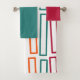 Ce kit de serviettes est doté d'un linge de toilette couleur betterave, d'une serviette de bain turquoise et d'une serviette de bain au design moderne du milieu du siècle avec des rectangles répétitifs en turquoise, orange, betterave et orange sur un champ de blanc. Si vous aimez le design mais préférez différentes couleurs, envoyez-moi un message.