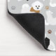 Niedliche Bichon frische Hunde in Pullover und Bogen mit verstreuten Hundeknochen und Pfotendrucken auf hellgrauem Hintergrund.