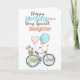 eine schöne Abbildung eines handgezogenen Fahrrads mit Blume auf seinen Rädern; ein Korb mit duftenden Blume und zwei Ballons, die in Pastellpfirsichen-Orange, Blau und Gelb mit dem Sattel verbunden sind. Die Worte, glücklicher Geburtstag einer ganz besonderen Tochter (die in Enkelin, Nichte, Paten usw. umgewandelt werden kann), erscheinen auf einem weißen Hintergrund. Das Innere hat eine schöne zarte Nachricht, die an den Anzug angepasst werden sollte, egal welches Familienverhältnis Sie vorne eingefügt haben.