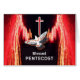 Bienheureuse Pentecôte avec Écriture biblique d'Actes 2 imprimé à l'intérieur, carte de voeux papier. Illustration numérique d'une colombe blanche volant vers le haut vers une croix rouge. Le feu et la lumière symbolisant l'esprit de Dieu se remplissent sur les côtés de l'image. Copyright © Shoaff Ballanger Studios, 2023.
