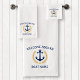 Personnalisez votre décor de bain avec une élégante serviette de bain à thème nautique affichant un message "Welcome Aboard" et votre nom de bateau, nom de famille ou autre texte souhaité. Ce design personnalisé comprend une ancre de bateau vintage, des feuilles de laurier de style or avec emblème étoilé sur un arrière - plan blanc. L'arrière de l'ensemble de serviettes est blanc et vous pouvez facilement changer la couleur primaire avant pour correspondre à votre décoration ou à votre thème actuel.