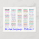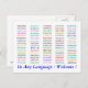 "Bienvenue" Carte postale en 80 langues Anglais Afrikaans Albanais Alsacien Arabe Bengali Biélorusse Bosniaque Breton Bulgare Catalan Cebuano Cantonais Mandarin Taiwainais Croate Corse Danois Néerlandais Finlandais Flamand Français Friulan Gaelic Galicien Allemand Gun Guarani Haïtien Créole Hawaiien Hindi Hongrois Coréen Hongrois Italien tokoli Lingala letton Lobjan lituanien luxembourgeois Macédonien Malgache Maori Maltais Minmongol Plus Norvégien Occitan Polonais Portugais Punjabi Romani Russe Roumain Sarde Logudorese Sesotho Shona Sinhala Slovanien Somalien Sopata Espagnol Swahili Suédois Tagalog Thai Turc Ouzbek Vietnamien Yoruba Anglais Afrikaans Albanais Alsacien Arabe Bengali Bengali Biélorusse Bosniaque Bulgare Catalan Cebuano Cantonais Chinois Mandarin Taiwainais Corse Croate Néerlandais Finlandais Flamand Français Frioulan Gaelic Gun Gân Gân Haïtien Hindi Hongrois Hongrois Islandais Italien Japonais Coréen Kotokoli Lingala Lobjan lituanien luxembourgeois Macédonien Malgache Malgache Maori Minmongol Plus Norvégien Occitan Polonais Portugais Punjabi Romani Russe Rwandais Sesotho Shona Sinhala Slovaque Slovanien Sopata Espagnol Swahili Suédois Tagalog Thaïlandais Turc Ouzbek Vietnamien Volapük Yoruba Zulu