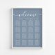 Élégant tableau de sièges bleu mariage téléchargeable, inscrivez-vous jusqu'à 16 tables avec "bienvenue" dans un script blanc chic avec des swashes et vos prénoms et la date de mariage réunis par un coeur. Vous pouvez sélectionner l'option de téléchargement numérique à modifier avec des modifications de dernière minute et imprimer localement.