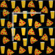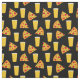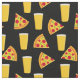 Schwarzes Gewebe gemustert mit Bierpints und Scheiben aus Pepperoni-Pizza