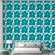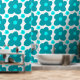 Big retro blue flowers pattern wallpaper. Teal and aqua blue colors on a white background.